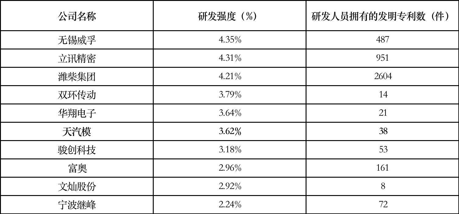 在研发强度方面,2021年,天汽模的研发投入占营业收入比重为3.63%(见表1),处于“零部件”赛道的平均水平。而在专利发明方面,该年度研发人员申请的发明专利为38件,远不及潍柴集团2604件、立讯精密951件、无锡威孚487件。造成这种情况的主要原因是,天汽模是一家专注于汽车模型的汽车部件生产企业,可研发的空间远不及大型零部件企业,所以发明专利数目较少,但天汽模非常重视生产技术的提高和器件模具的创新,未来仍有很大的发展空间。