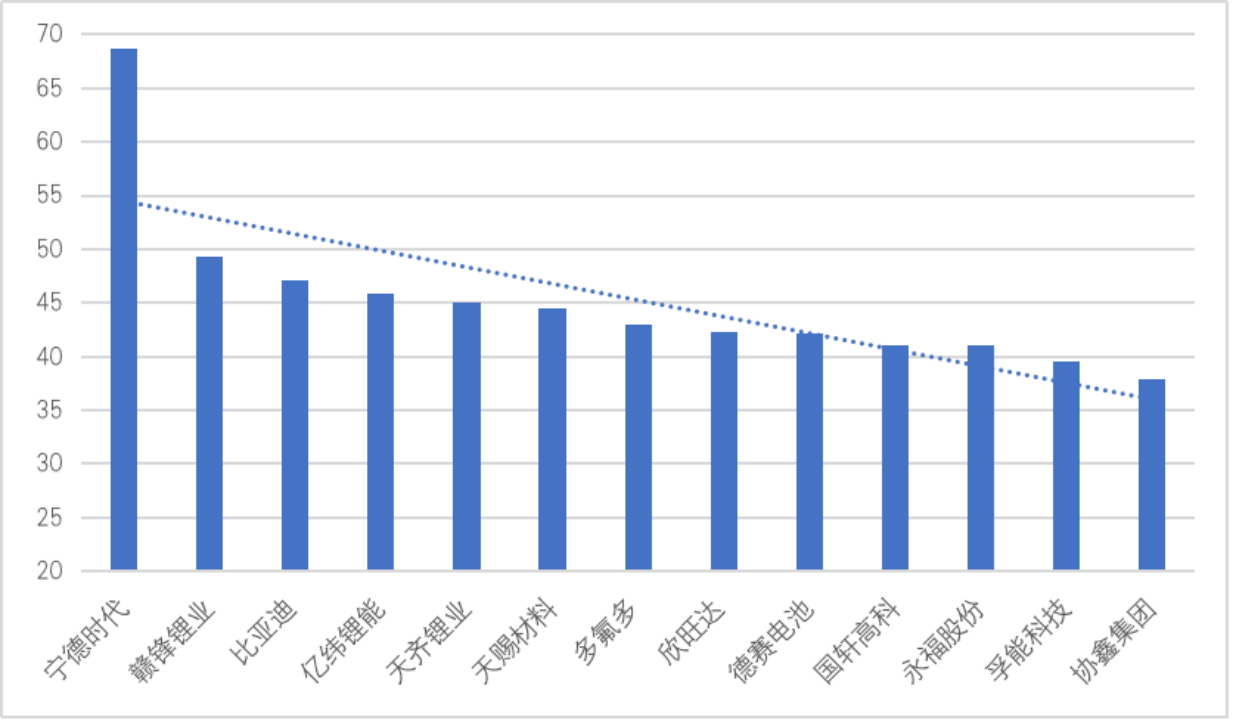 图1 “电池产业链”赛道企业品牌优势值(100分制)