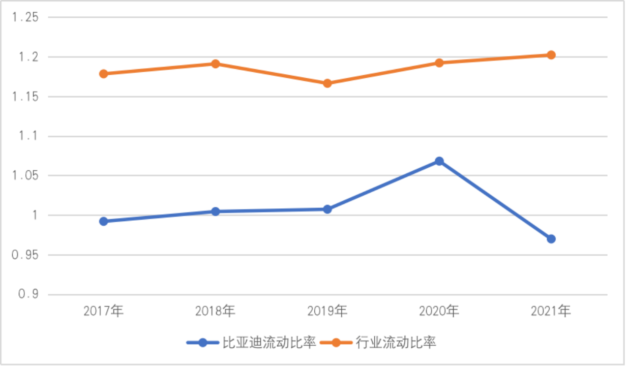 图2 2017年~2021年比亚迪和所在行业的流动比率变动情况