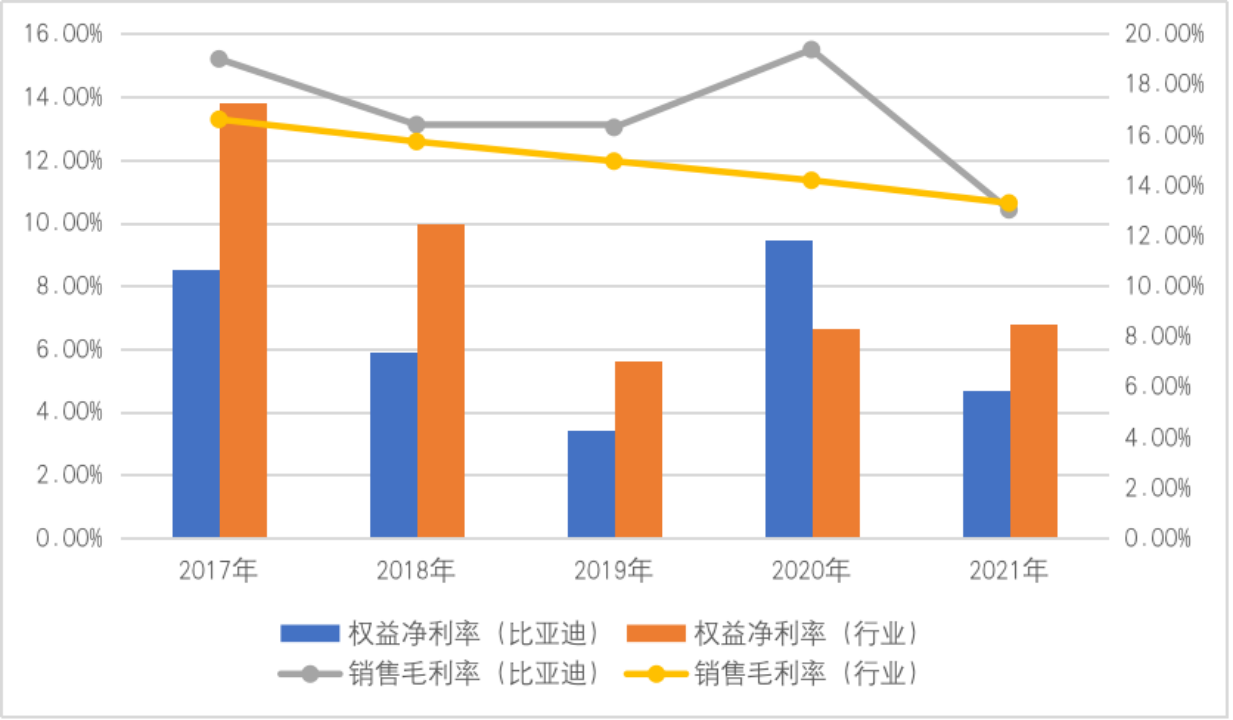 图3 2017年~2021年比亚迪和所在行业的盈利能力变动情况