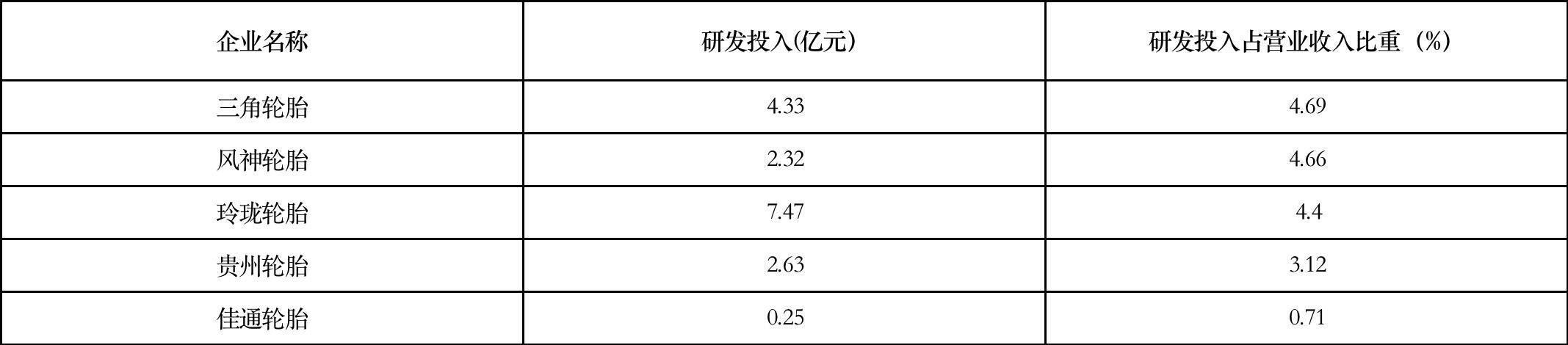 玲珑轮胎拥有博士后工作站、院士工作站,建设了中国轮胎行业内第一家轮胎单体噪声实验室,以及低滚动阻力实验室、轮胎NVH实验室、动力学实验室等前沿科研创新平台。此外,2020-2022年,玲珑轮胎的研发投入分别为7.63亿元、9.34亿元、7.48亿元,占营业收入的占比分别为4.15%、5.03%、4.40%,可以看出近年玲珑轮胎在研发投入的数目上有进行小幅度的调整,但整体维持在占营业收入的4-5%左右。2022年玲珑轮胎的研发投入占比与同赛道的三角轮胎(4.69%)、风神轮胎(4.66%)均位于上游水平(见表1),研发强度较高。