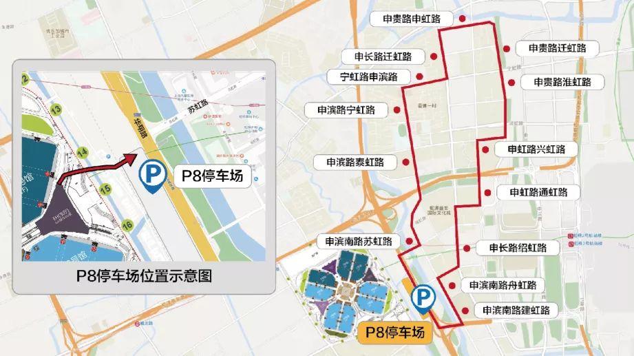 P8停车场、申滨南路建虹路、申滨南路舟虹路、申长路绍虹路、申虹路通虹路、申虹路兴虹路、申贵路淮虹路、申贵路迁虹路、申贵路申虹路、申长路迁虹路、宁虹路申滨路、申滨路宁虹路、申滨路泰虹路、申滨南路苏虹路、P8停车场(单向环线)