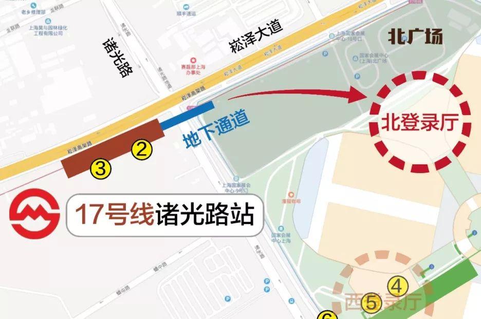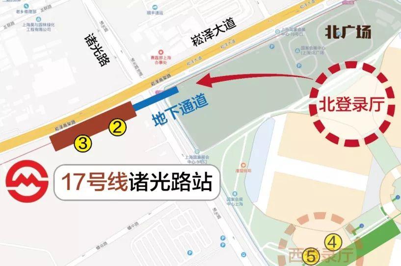 观众可根据场馆的标识指引到达北广场西北角,通过过街地道前往17号线诸光路站。