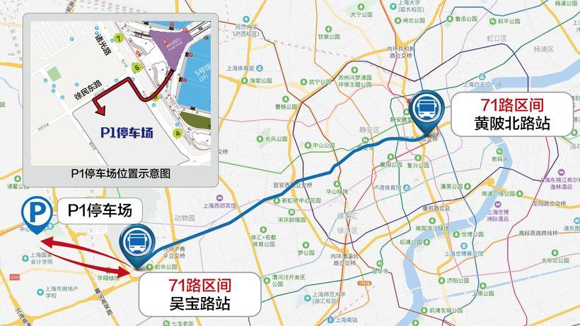 停靠71路区间黄陂北路站至吴宝路站各站后,直达P1停车场(注:申昆路枢纽站不停靠)