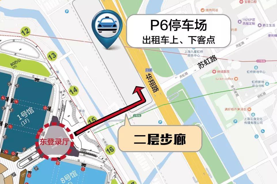 从国家会展中心东登录厅出发,沿二层歩廊向东步行,至P6停车场下楼梯,到达出租车乘客排队区候车。