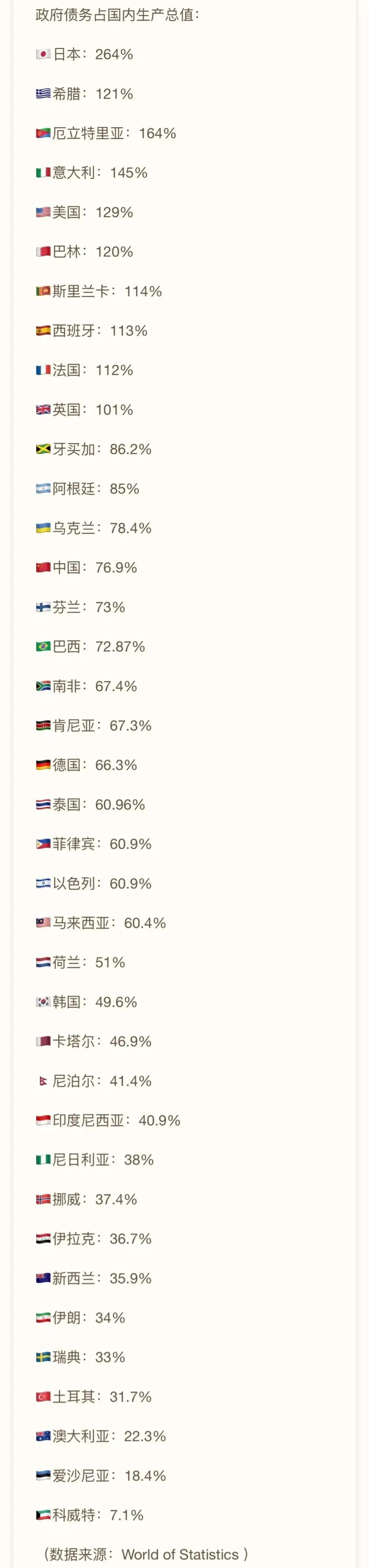 【债务】世界部分主要国家,政府负债情况一览,我国看着还不错哦-中国地方政府欠债多少